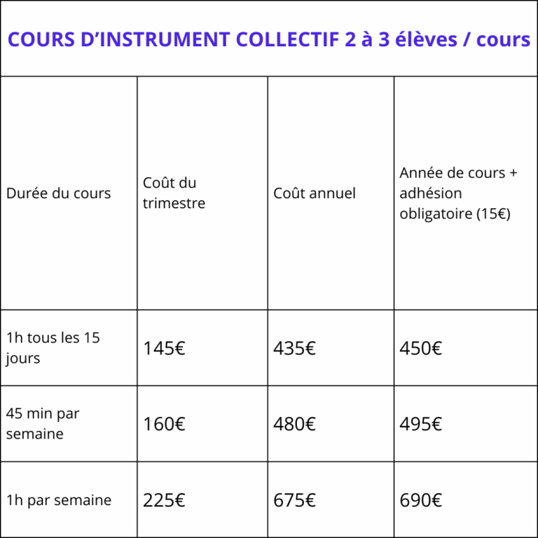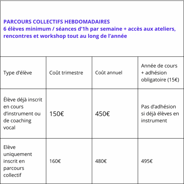 > Le parcours collectif est d’une heure par semaine au même tarif.