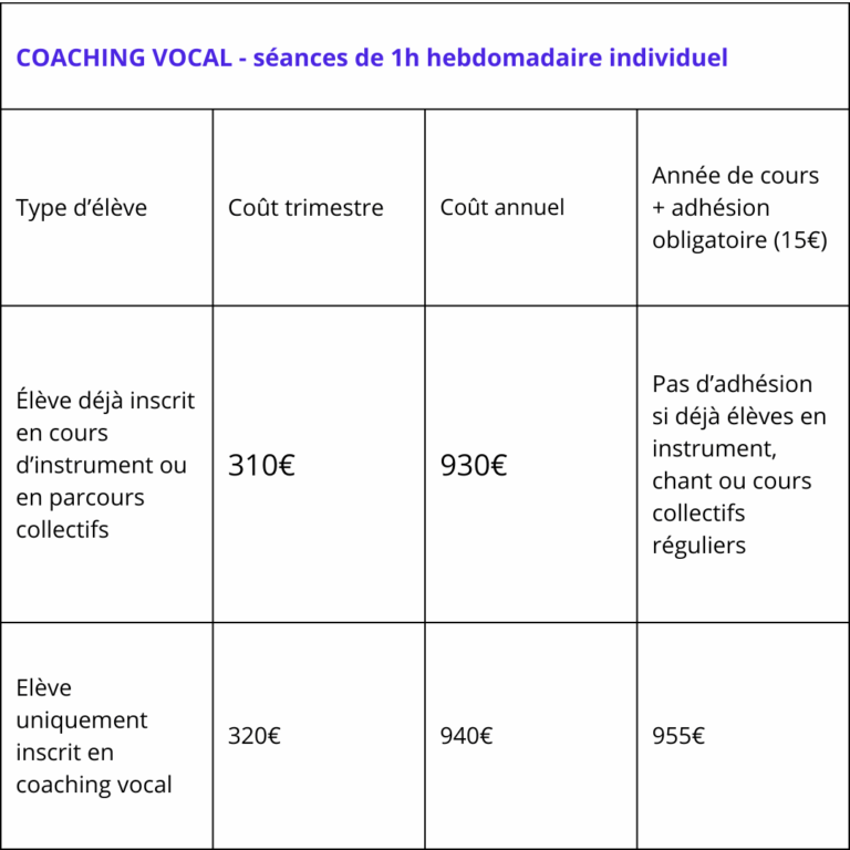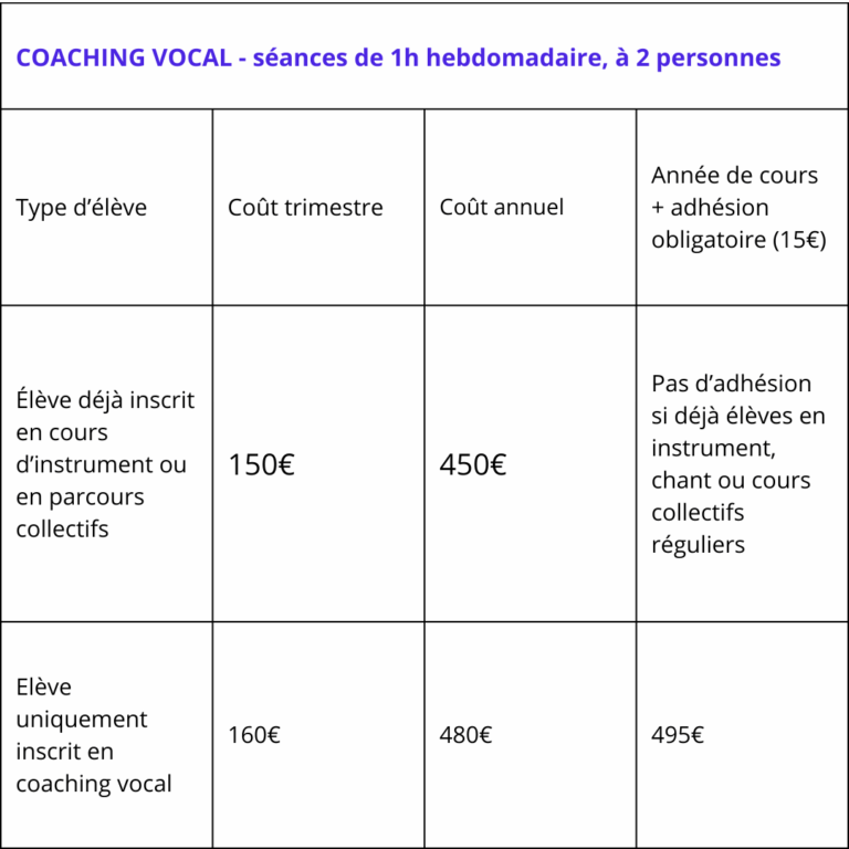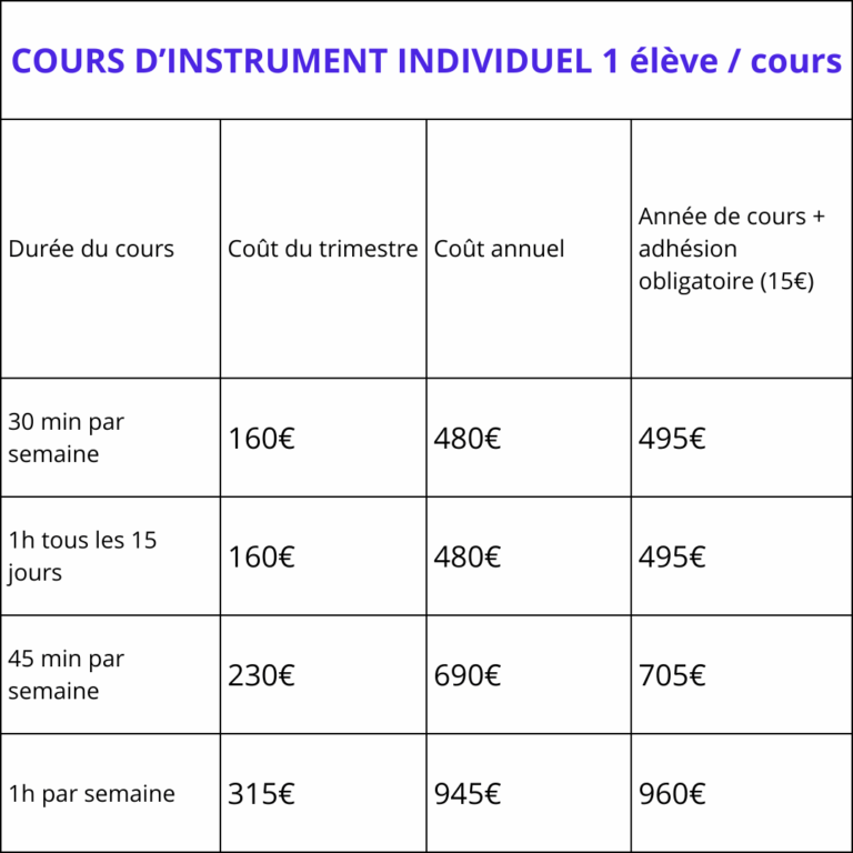 Pour un cours individuel : 160€ le trimestre. À raison de 2h par mois, 2X1h (toutes les deux semaines) ou 4 fois 30 minutes.