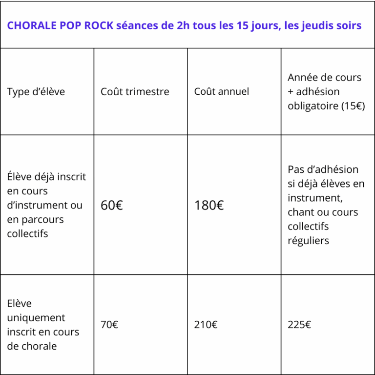 Une réduction familiale de 10€ / personne s’applique, uniquement sur les cours d’instrument individuels et collectifs. Elle ne s’applique pas sur les cours collectifs hebdomadaires, les cours collectifs forfait “à la carte” et la chorale pop rock. Exemple : un enfant prend 45 min hebdo de cours de batterie en collectif, et un parent prend 1h par semaine de cours individuel de basse.