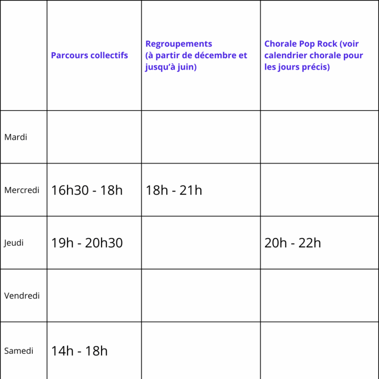 - les samedis de 14h à 18h