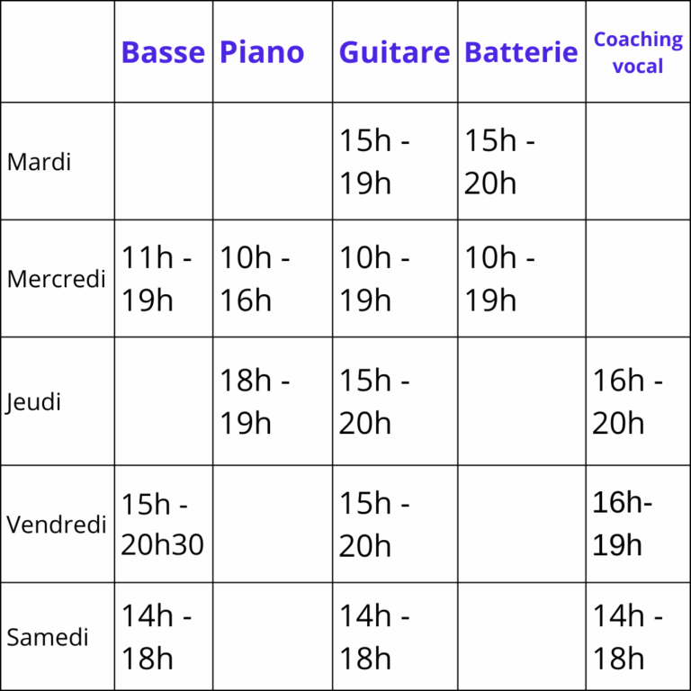 Il y a des cours de basse, de guitare, de coaching vocal, de batterie, de piano, en individuel comme en collectif.